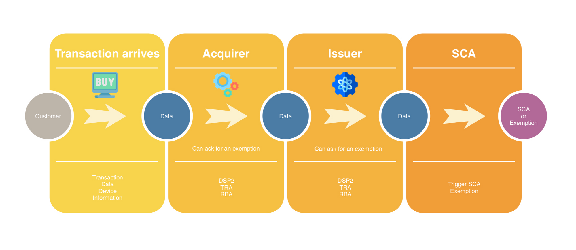 Exemptions are also based on the Risk-Based Authentication (RBA). RBA is a fraud analysis process where the Issuer (or the Acquirer) calculate the risk of fraud for a transaction and determine whether the bank wants to apply SCA or not.