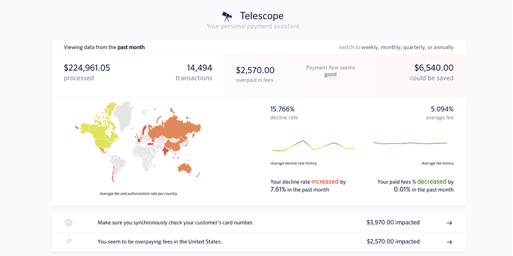 If you have read our article about the secret life of a transaction, you know that failed payments can be hard to analyze, and even harder to recover. This is why we introduced a product called Telescope in January of last year. We designed Telescope to improve the view online merchants have of their payment flow, and to give them a deeper understanding of what is happening in their payment infrastructure (what we affectionately call “the black box”).
