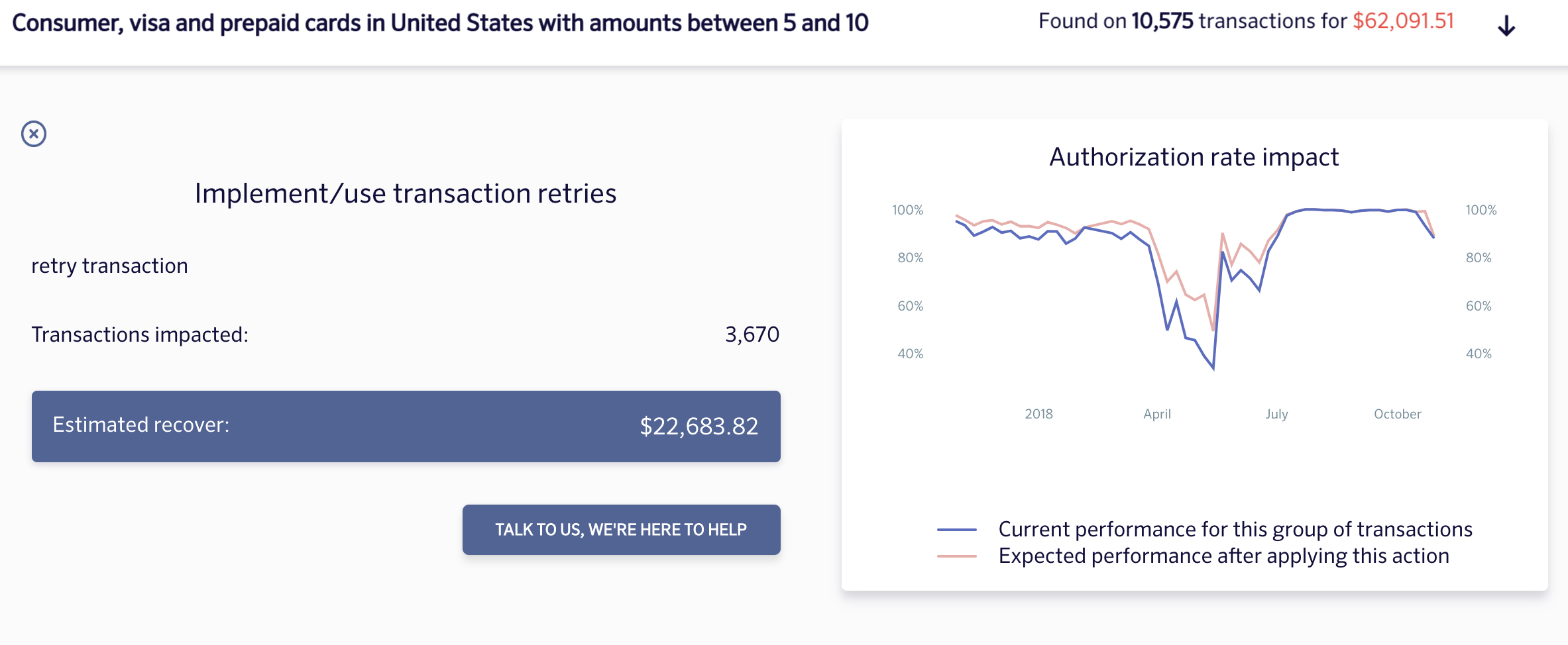As mentioned previously, Telescope Diagnosis is a tool specialized in recognizing bad authorization patterns. We use additional models to generate custom recommendations for every issue uncovered by the algorithm. This allowed us to upgrade three key features for merchants: